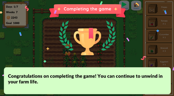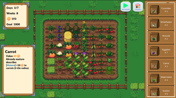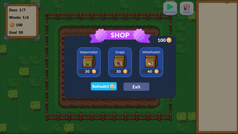 One day, tired of city life, you decide to rent a farm and start anew. You need to earn your weekly rent by buying seeds from the store and growing crops.The rent will gradually increase as the game progresses.Strategic crop combinations can significantly boost your earnings.Happy farming!